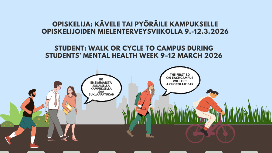 As part of Students’ Mental Health Week, we are organizing a campaign to encourage everyone to come to campus or to your studies by walking or using other forms of physical activity. If your journey is long, it’s enough to walk just part of the way. For example, get off public transport earlier than usual and walk the rest of the way. The first 80 active students at each campus will receive a chocolate bar to brighten their day!