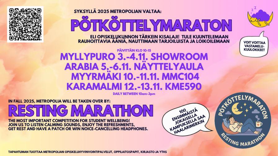 Resting Marathon is organized in collaboration with Metropolia’s Student Wellbeing Services, FSHS (Finnish Student Health Service), University Chaplains, and Library Services.