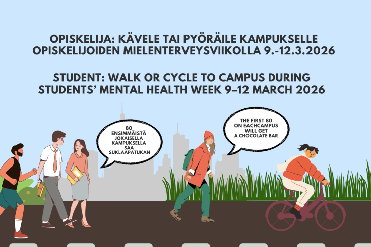 Kävele tai tule muuten liikkuen kampuksille Opiskelijoiden mielenterveysviikolla 9.-13.3., saat suklaapatukan